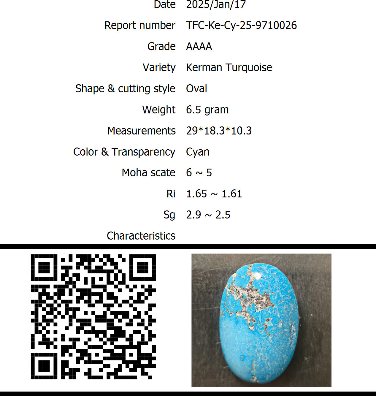 The stone Kerman Turquoise with a beautiful Cyan, weighing 6.5 gram, has a hardness of 6 ~ 5 and a specific gravity of 2.9 ~ 2.5 with a refractive index of 1.65 ~ 1.61.It has been cut in Oval and bears certificate number TFC-Ke-Cy-25-9710026, issued on 2025/01/17 by IGA-Global.