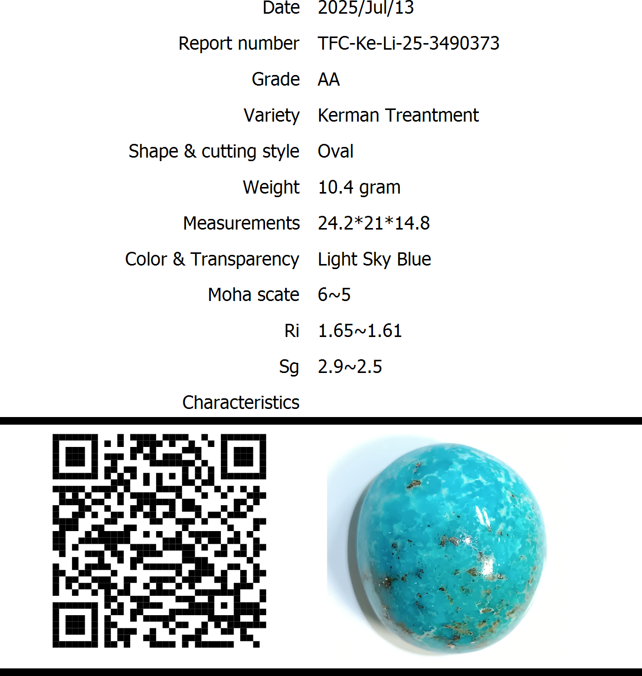 The stone Kerman Treantment with a beautiful Light Sky Blue, weighing 10.4 gram, has a hardness of 6~5 and a specific gravity of 2.9~2.5 with a refractive index of 1.65~1.61.It has been cut in Oval and bears certificate number TFC-Ke-Li-25-3490373, issued on 2025/07/13 by IGA-Global.