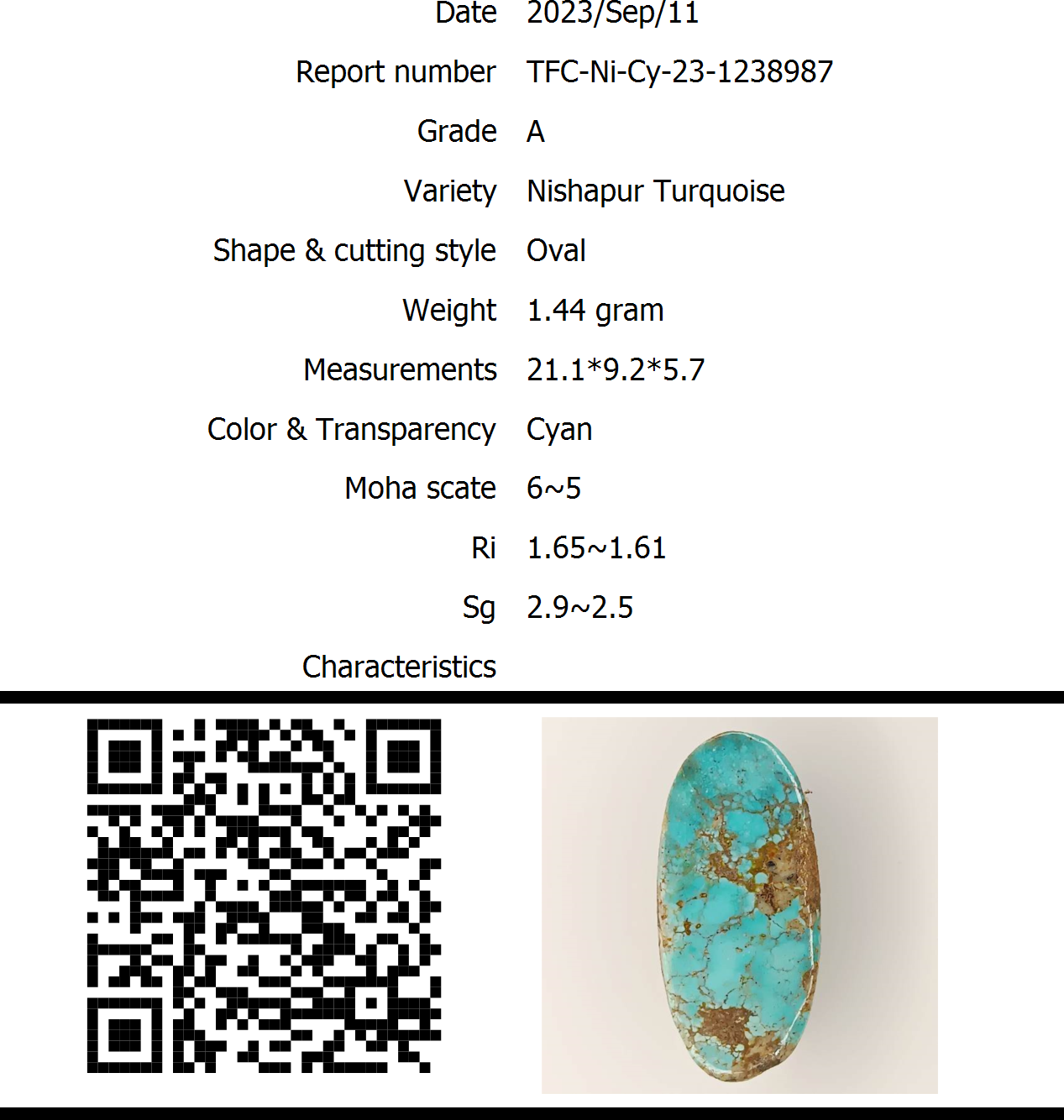 The stone Nishapur Turquoise with a beautiful Cyan, weighing 1.44 gram, has a hardness of 6~5 and a specific gravity of 2.9~2.5 with a refractive index of 1.65~1.61.It has been cut in Oval and bears certificate number TFC-Ni-Cy-23-1238987, issued on 2023/09/11 by IGA-Global.