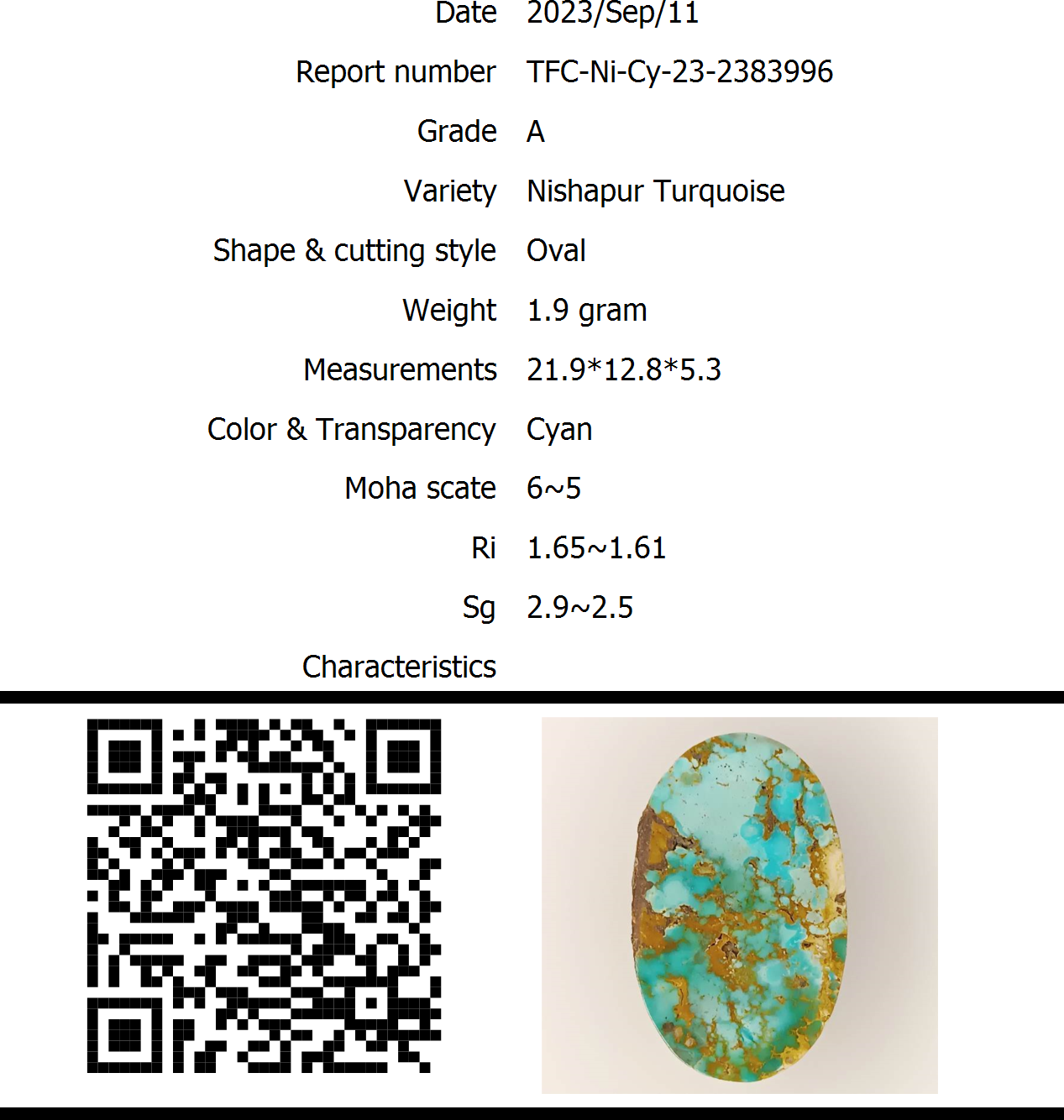 The stone Nishapur Turquoise with a beautiful Cyan, weighing 1.9 gram, has a hardness of 6~5 and a specific gravity of 2.9~2.5 with a refractive index of 1.65~1.61.It has been cut in Oval and bears certificate number TFC-Ni-Cy-23-2383996, issued on 2023/09/11 by IGA-Global.