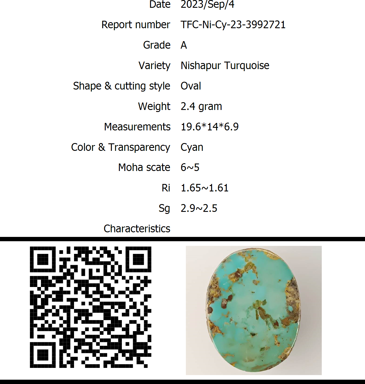 The stone Nishapur Turquoise with a beautiful Cyan, weighing 2.4 gram, has a hardness of 6~5 and a specific gravity of 2.9~2.5 with a refractive index of 1.65~1.61.It has been cut in Oval and bears certificate number TFC-Ni-Cy-23-3992721, issued on 2023/09/04 by IGA-Global.