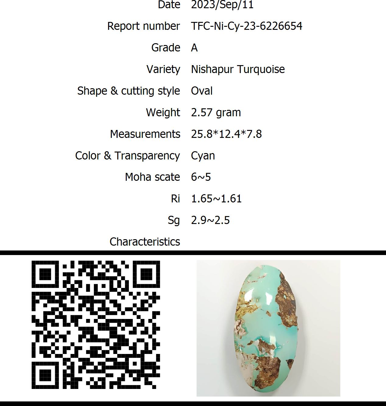The stone Nishapur Turquoise with a beautiful Cyan, weighing 2.57 gram, has a hardness of 6~5 and a specific gravity of 2.9~2.5 with a refractive index of 1.65~1.61.It has been cut in Oval and bears certificate number TFC-Ni-Cy-23-6226654, issued on 2023/09/11 by IGA-Global.