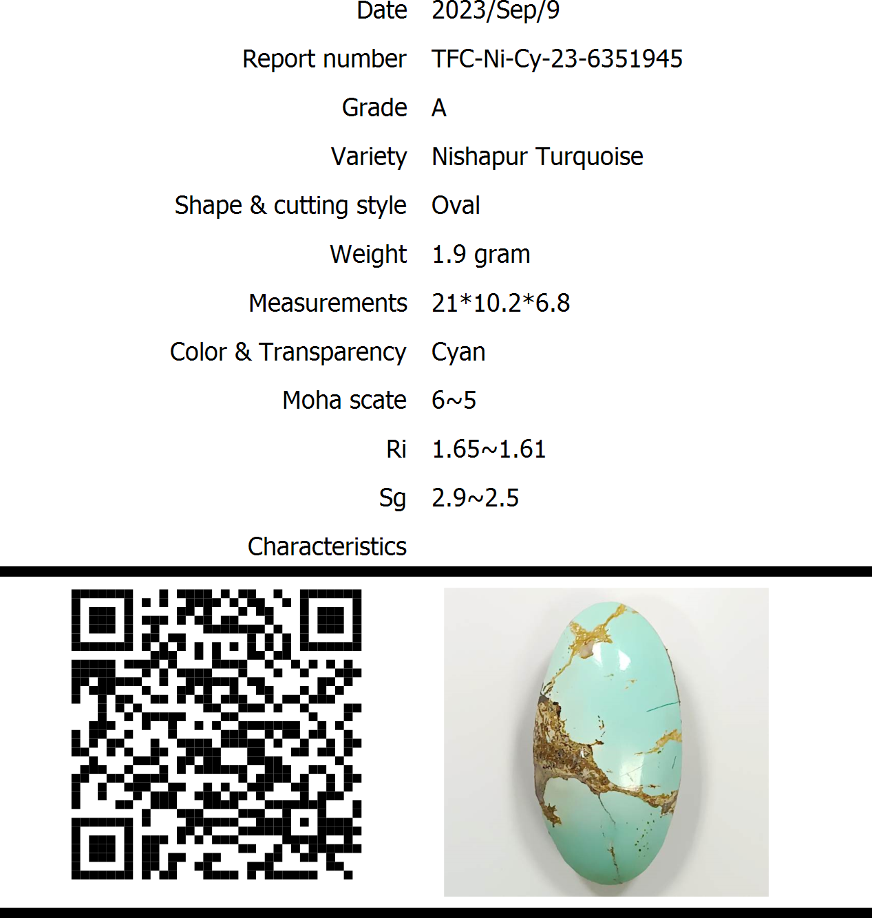 The stone Nishapur Turquoise with a beautiful Cyan, weighing 1.9 gram, has a hardness of 6~5 and a specific gravity of 2.9~2.5 with a refractive index of 1.65~1.61.It has been cut in Oval and bears certificate number TFC-Ni-Cy-23-6351945, issued on 2023/09/09 by IGA-Global.