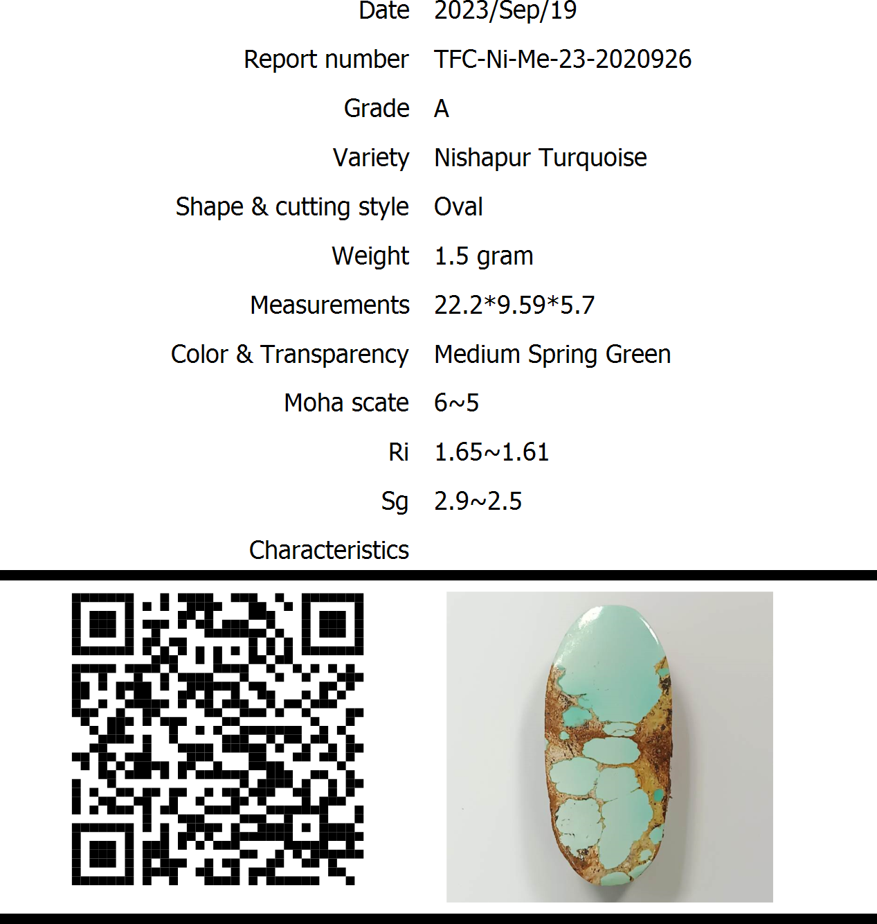 The stone Nishapur Turquoise with a beautiful Medium Spring Green, weighing 1.5 gram, has a hardness of 6~5 and a specific gravity of 2.9~2.5 with a refractive index of 1.65~1.61.It has been cut in Oval and bears certificate number TFC-Ni-Me-23-2020926, issued on 2023/09/19 by IGA-Global.
