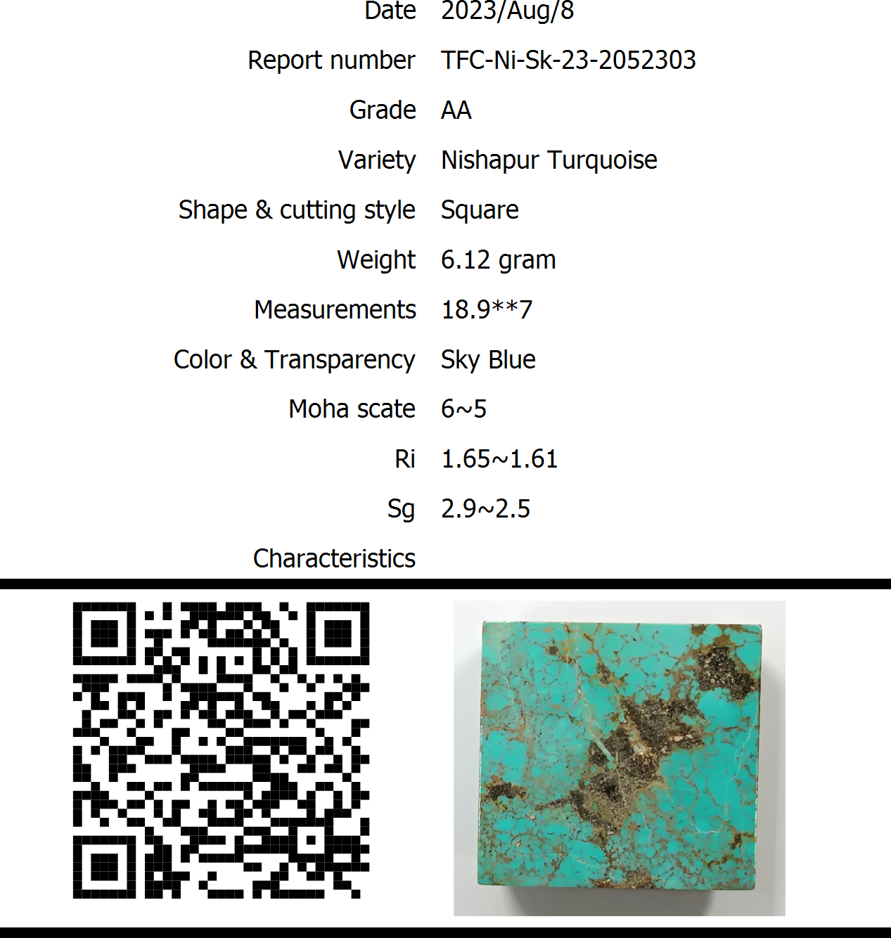 The stone Nishapur Turquoise with a beautiful Sky Blue, weighing 6.12 gram, has a hardness of 6~5 and a specific gravity of 2.9~2.5 with a refractive index of 1.65~1.61.It has been cut in Square and bears certificate number TFC-Ni-Sk-23-2052303, issued on 2023/08/08 by IGA-Global.