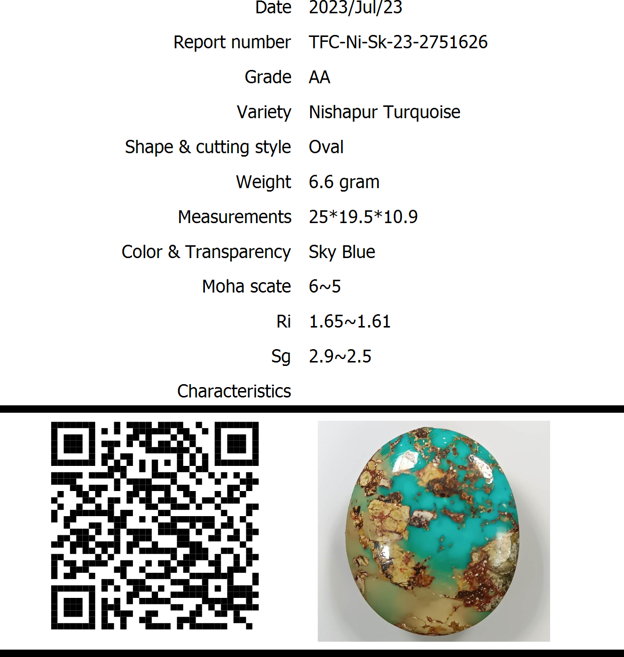 The stone Nishapur Turquoise with a beautiful Sky Blue, weighing 6.6 gram, has a hardness of 6~5 and a specific gravity of 2.9~2.5 with a refractive index of 1.65~1.61.It has been cut in Oval and bears certificate number TFC-Ni-Sk-23-2751626, issued on 2023/07/23 by IGA-Global.