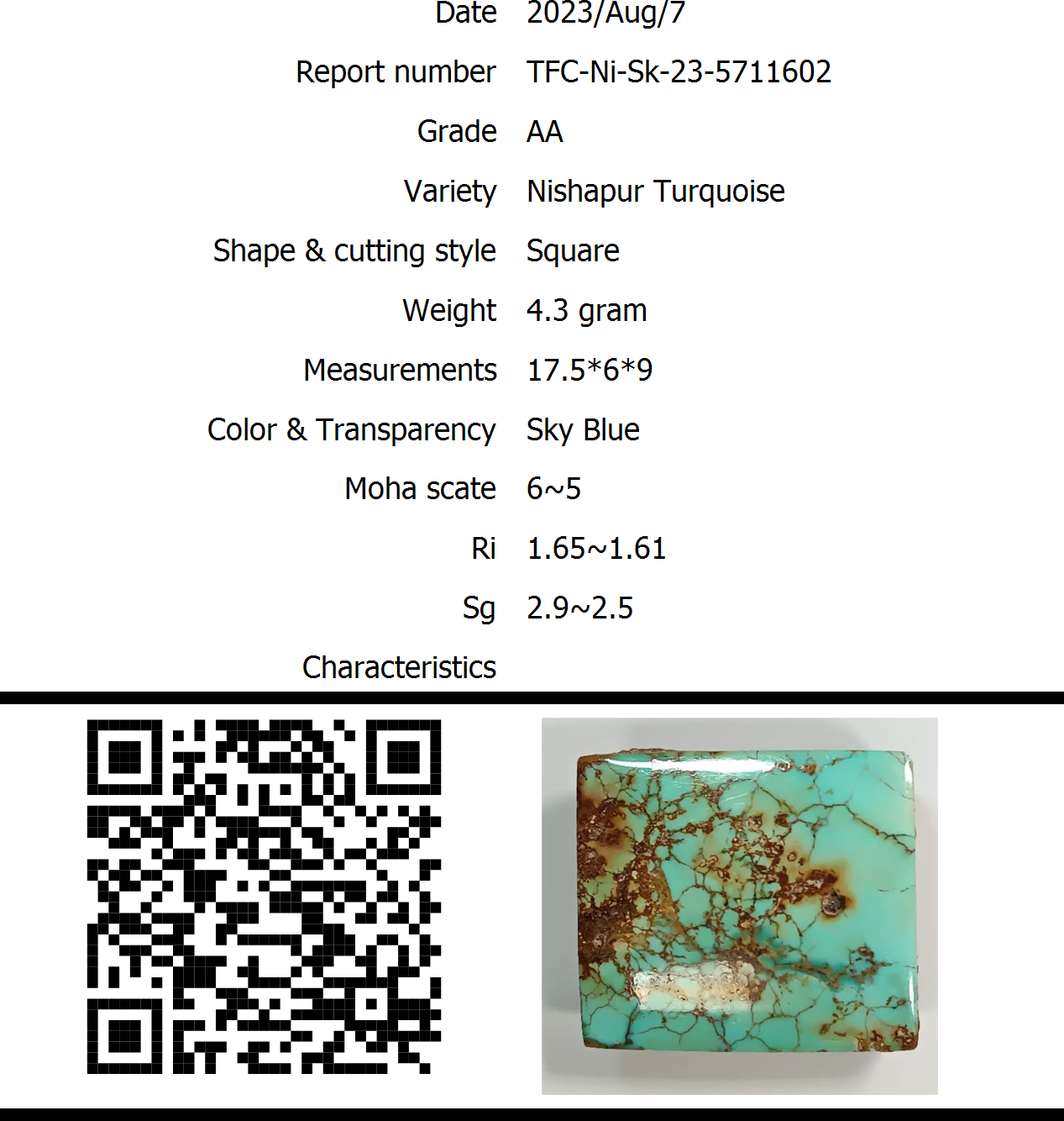 The stone Nishapur Turquoise with a beautiful Sky Blue, weighing 4.3 gram, has a hardness of 6~5 and a specific gravity of 2.9~2.5 with a refractive index of 1.65~1.61.It has been cut in Square and bears certificate number TFC-Ni-Sk-23-5711602, issued on 2023/08/07 by IGA-Global.