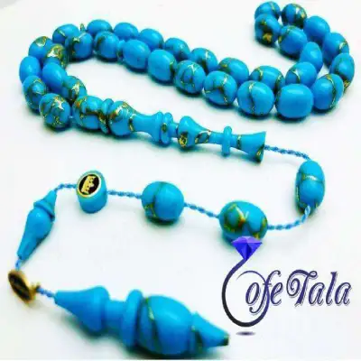 تسبیح فیروزه فاخر با شیخک تراش دست گ رگهای طلادار فیروزه عجمی کار دست و دست تراش