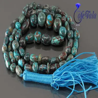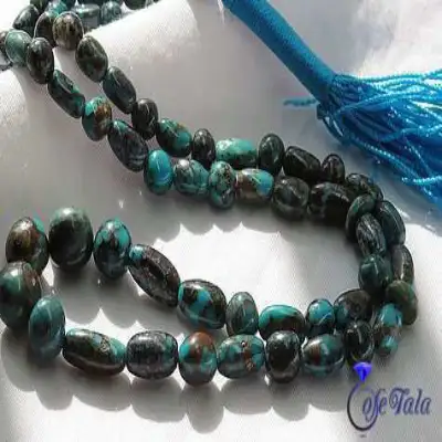 تسبیح فیروزه نیشابوری 65 دانه رنگ تقویت شده است و مناسب خانم ها و آقایان است و تقریبا ۱۹ گرم وزن دارد و ۲۵ سانتی متر است. نگین های آن با تکنیک های گوهرشناسی رنگ آن تقویت شده است.